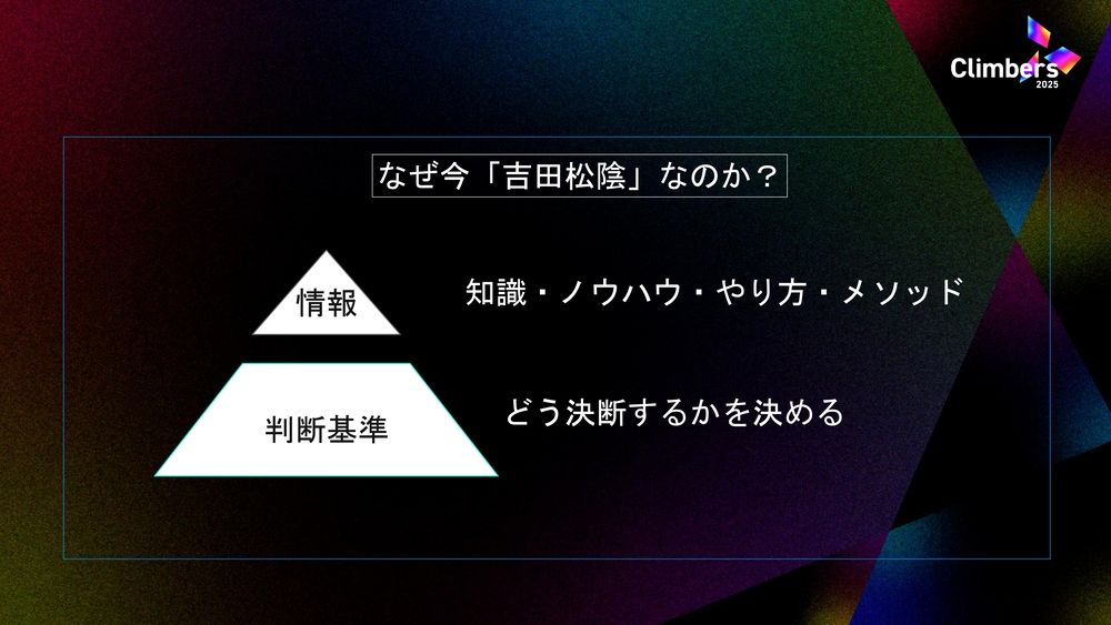 一方で、みなさまも実感があると思いますけれども、「その情報を使って、動き出せる人と動き出せない人は何が違うのか?」というのが、みなさまのピラミッドの下のところに書いてある、「判断基準」なんですよね。