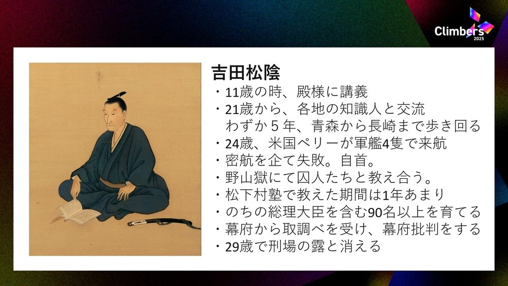 歴史の授業ではないので吉田松陰について簡単にお届けしていきますと、吉田松陰は11歳の時に、殿様に抗議をするところから始まります。小学校5年生ぐらいの段階で、県知事に抗議するみたいな状態ですね。なので、学問のお守りとかになっていたりもします。