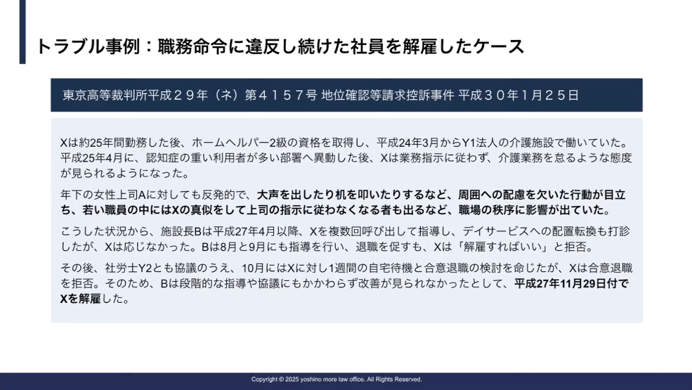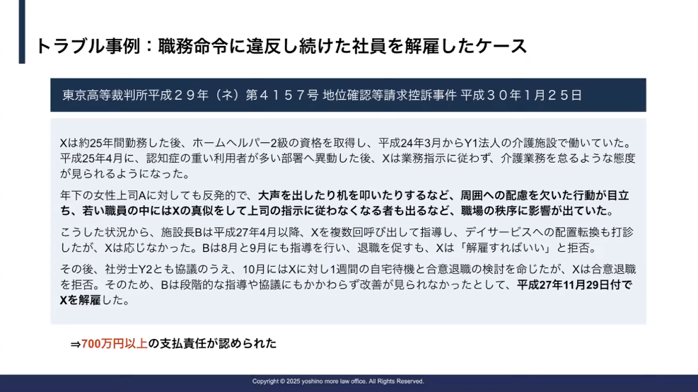 ですので、この状況から考えた時に、かなり会社としては社労士の先生と相談した上で慎重に進めていたけれども、結果的には解雇ができなかった事例ですね。
