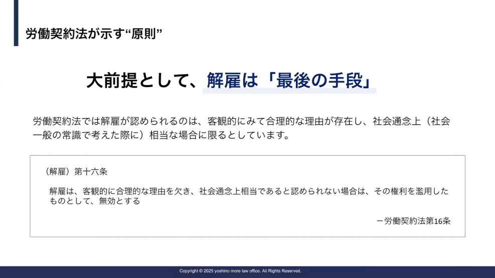 ここで、最初にみなさんにお伝えしたいこと。これはもう本当によく知られていることで大変恐縮ですが、裁判所が考えていることとしては、解雇は最後の手段だということですね。