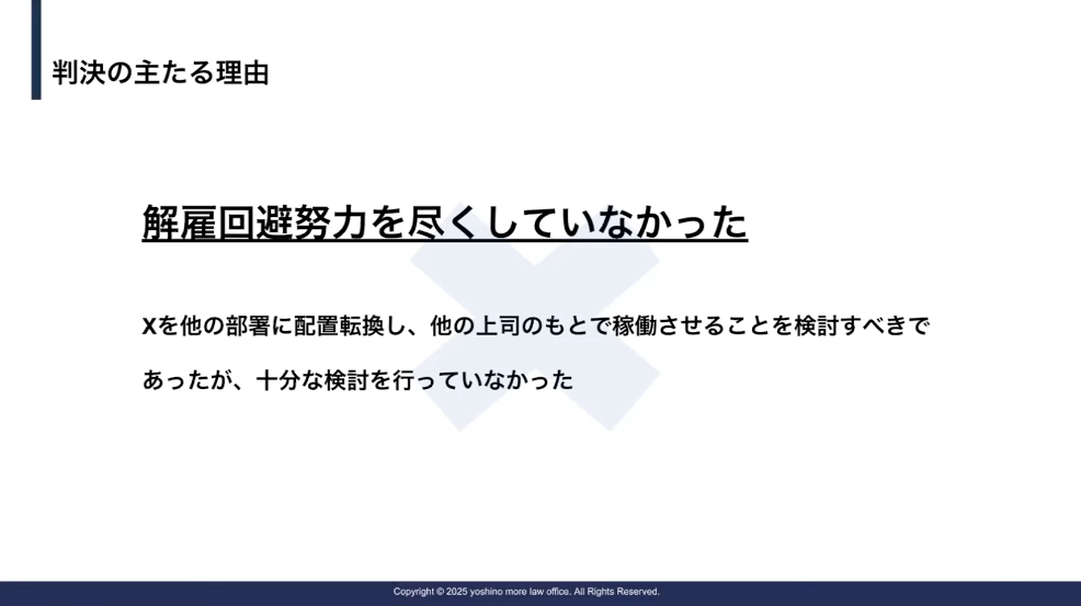 吉野:本日のテーマに非常に関連することではありますが、この判例では、解雇を回避する努力を尽くしていなかったという理由で、解雇が認められませんでした。