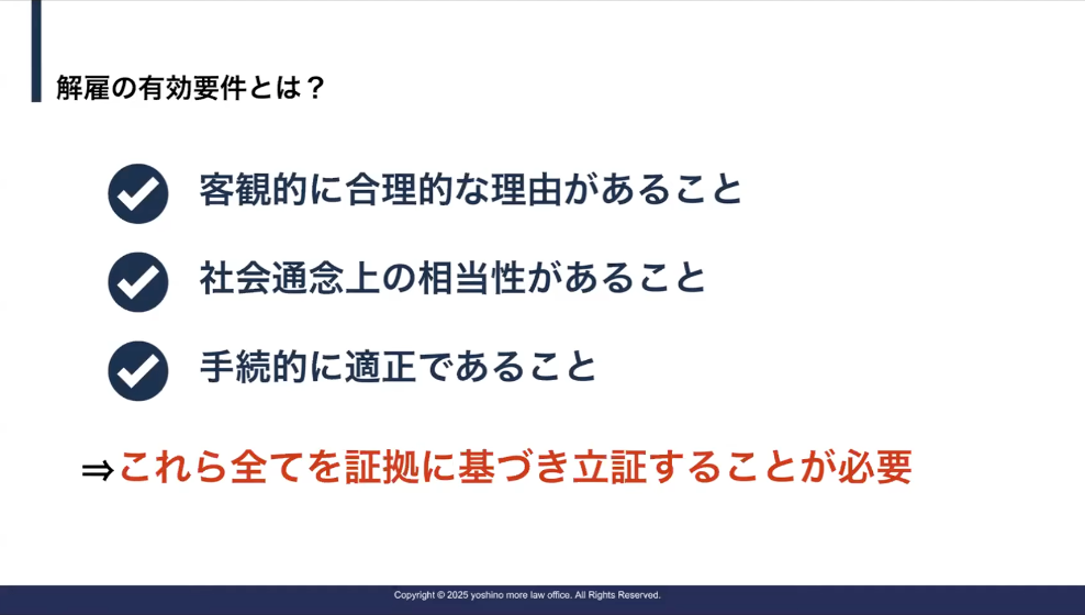 吉野:さらに、解雇の有効要件というものがあります。主にこの2つですね。「客観的に合理的な理由があること」「社会通念上の相当性があること」というかたちで裁判所のほうは判断しますが、さらに3つ目。わかりやすいところでいくと、「手続的に適正である」ということですね。この3つが整っているかどうかで解雇が有効かどうかが考えられます。