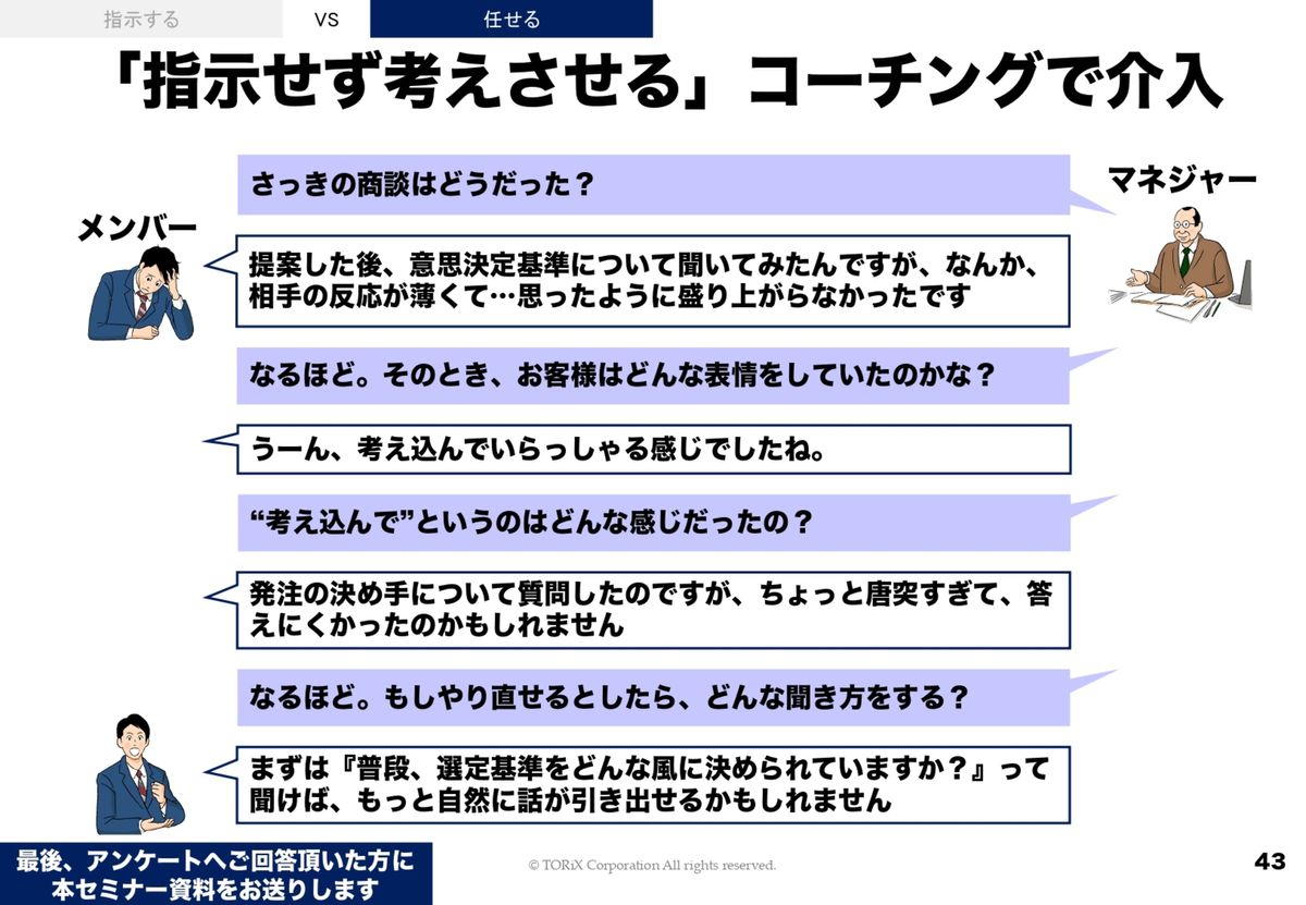 先ほどの「指示する」のほうのティーチングとだいぶ違いますよね。「指示する」のほうのティーチングは、マネージャーが正解をあげてしまうわけです。ただ「任せる」の場合は、ちょっとまどろっこしく感じられるかもしれませんが、ちゃんと導いていくわけですよね。正解をマネージャーが言わない。