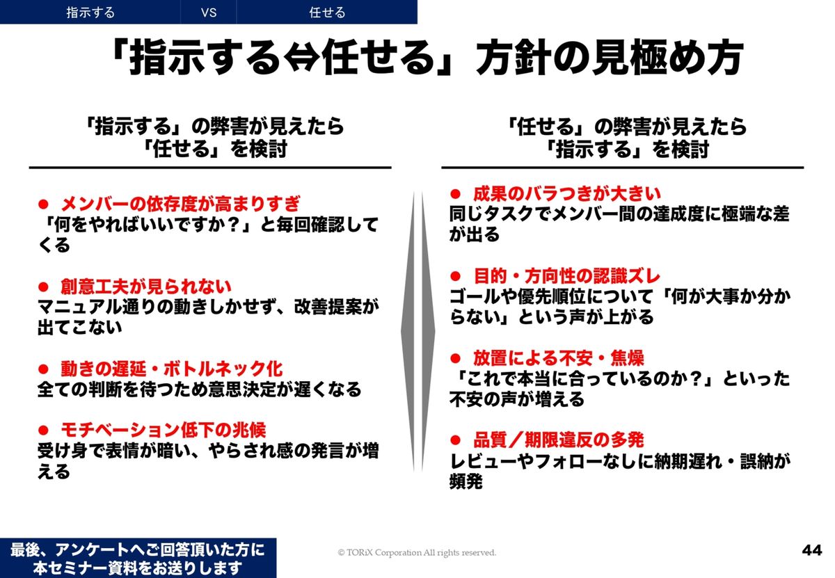 「任せる」というのをやっても、例えばばらつきが大きくなってきたとか、目的とか方向性がずれてきたかなとか、放置によってメンバーの焦りが生まれているんじゃないかとか、品質の不安が出てきたみたいなことが出てきたら、今度は「指示する」のほうに行こうかということです。