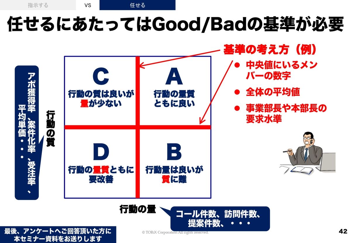 これを基準として置いて、その基準に対してGood、Badで見ていくということですね。中央値は全体の真ん中にいる人の数字を見たりとか、平均で見たりとか、あるいはトップの決めの問題というかたちで決めていくわけです。