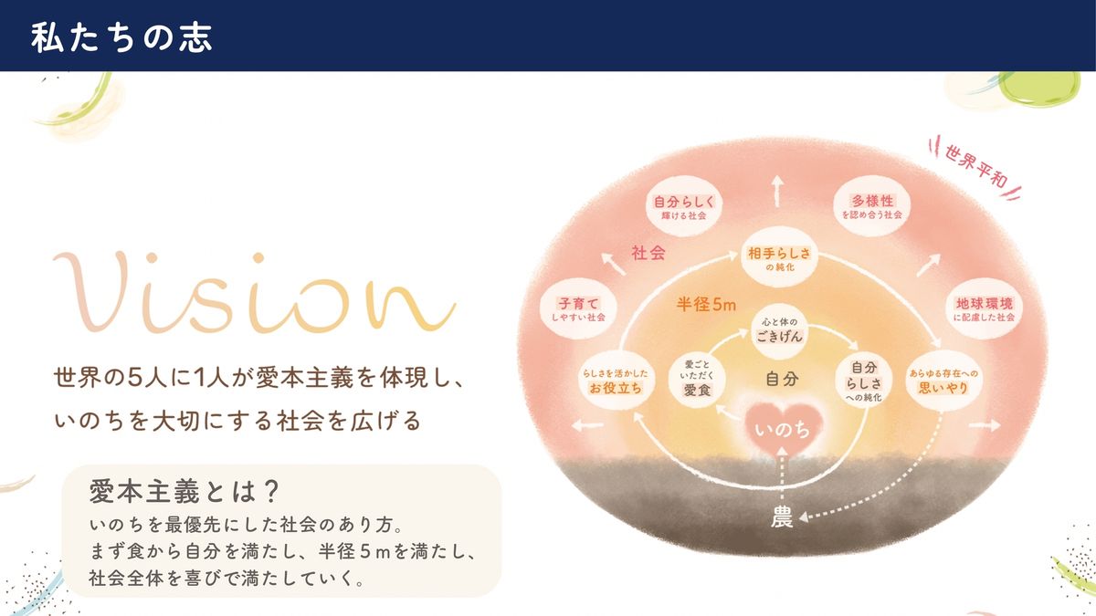 「いのち」を真ん中にする社会のあり方という中で、資本主義ではお金が中心の主義、社会のあり方だとするならば、今一度、本当に「いのち」のポテンシャルを最大発揮するということにおいて社会を作っていけないかということをビジョンにしています。