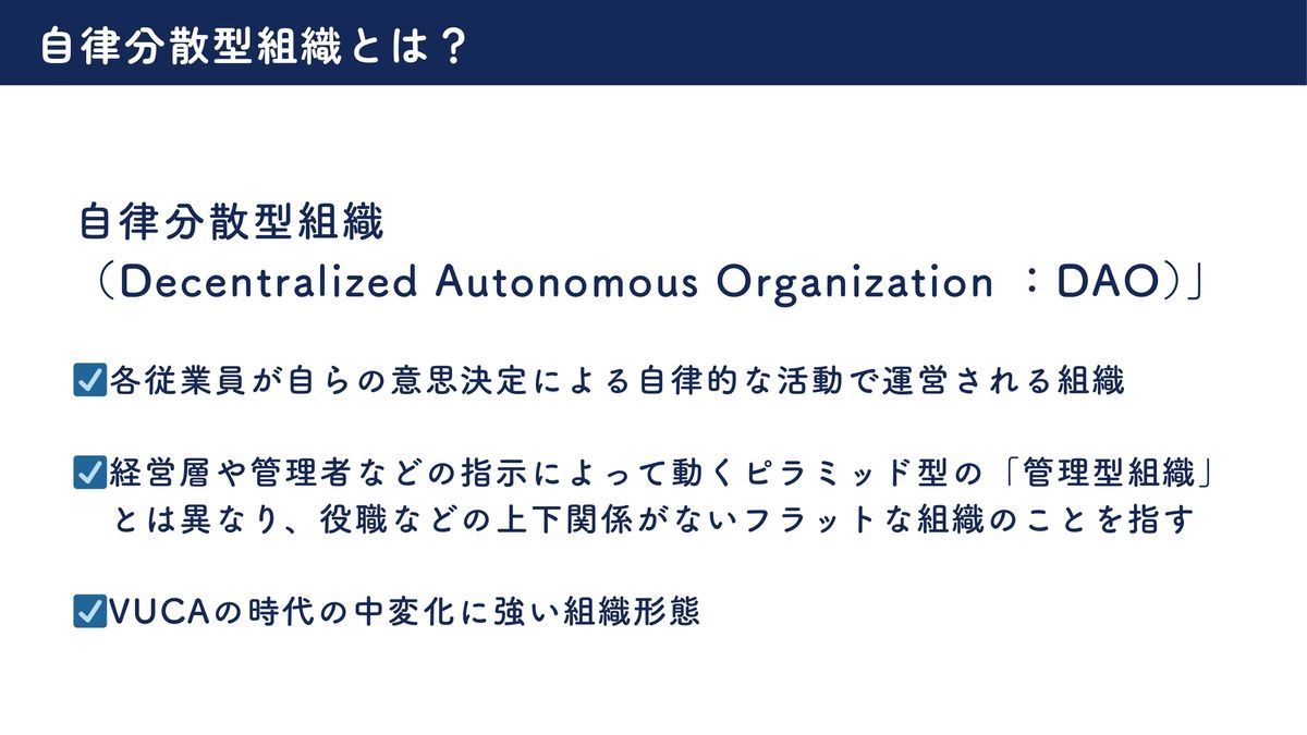 あべ:(スライドを示して)あらためて、一般的な定義としての自律分散型組織について書いています。DAOという言葉は最近Web3.0の文脈からもよく聞くと思いますが、DAO型組織と言ったりするものと同じです。従業員自ら意思決定することによって、自律的な活動で運営されていくような組織形態です。
