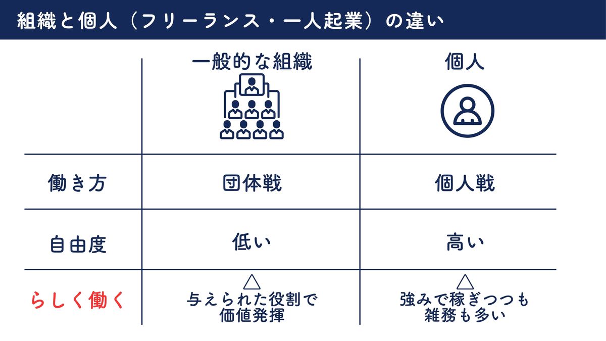 らしく働くことを考えた時に、「フリーランスで自由にいこうぜ」みたいな感じで、個人(での働き方)を選ばれる方もけっこういると思います。私も1人起業をしていますので、個人戦もやっていました。