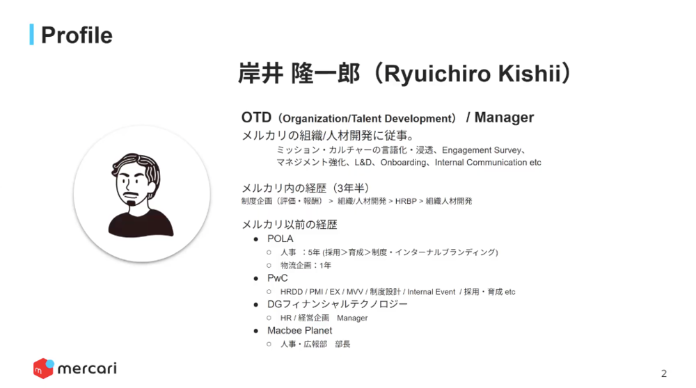 私からは、まずは概要のところだけご紹介させていただきたいと思います。簡単に自己紹介だけさせていただくと、メルカリでの勤続年数は3年半ほどになっていまして、私が今いるところはオーガニゼーションのタレントデベロップメントです。いわゆる組織開発・人材開発のチームのマネージャーをしています。