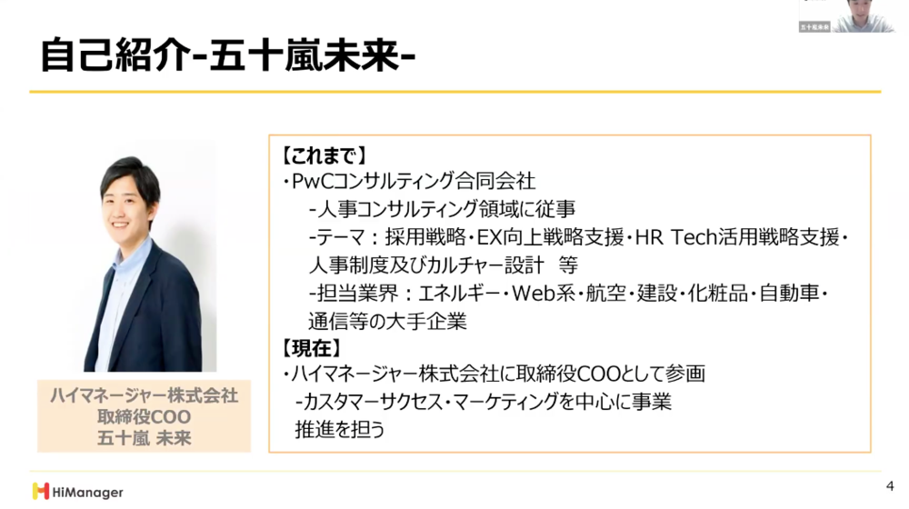 私はハイマネージャーの五十嵐と申します。私自身、前職ではPwCというところで人事コンサルをしておりました。岸井さまとの今回のセミナーにつきましても、実は岸井さまが前職の先輩であるということでご縁をいただいておりますので、そういった状況で開催させていただいております。