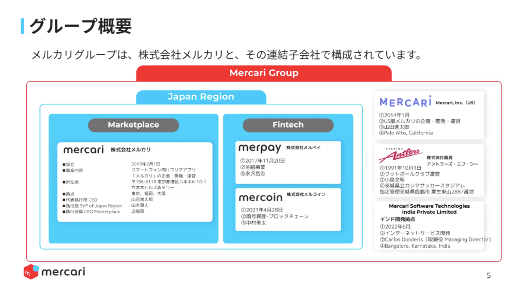メルカリは、実は株式会社メルカリというところ以外にも、株式会社メルペイ、株式会社メルコインといった法人が国内に2つあります。それ以外にも、メルカリUSや鹿島アントラーズ、あとはインドにも開発拠点があったりするので、法人がいくつか集まっている状況になっています。