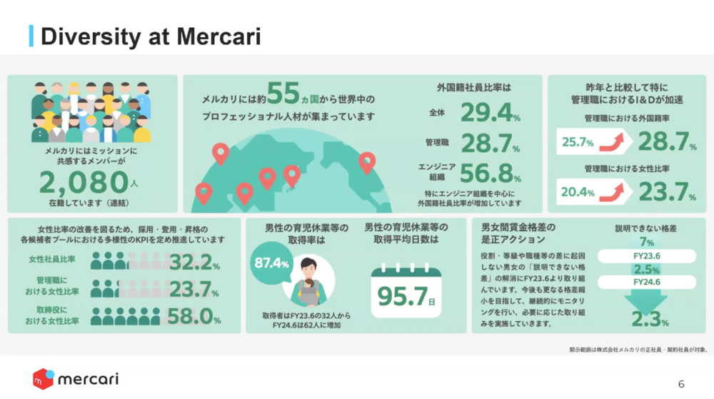 岸井:もう1つがダイバーシティという観点ですね。メルカリは、いろんな国籍の方のジェンダーの多様性もかなり意識をしておりまして、現在は約55ヶ国からいろんな方がメルカリに就業をしてメンバーになっています。