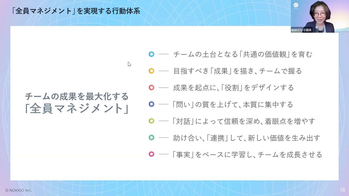 この「全員マネジメント」を、単なるコンセプトや概念ではなく、「具体的に何がチームの中に根ざしていれば実践につながるのか」を、私たちのほうで7つの行動体系にまとめています。