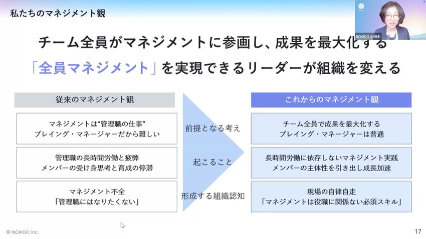 ・小田木氏は「全員マネジメント」概念を通じて、階層型組織の限界と新しいチーム運営の可能性を提示。