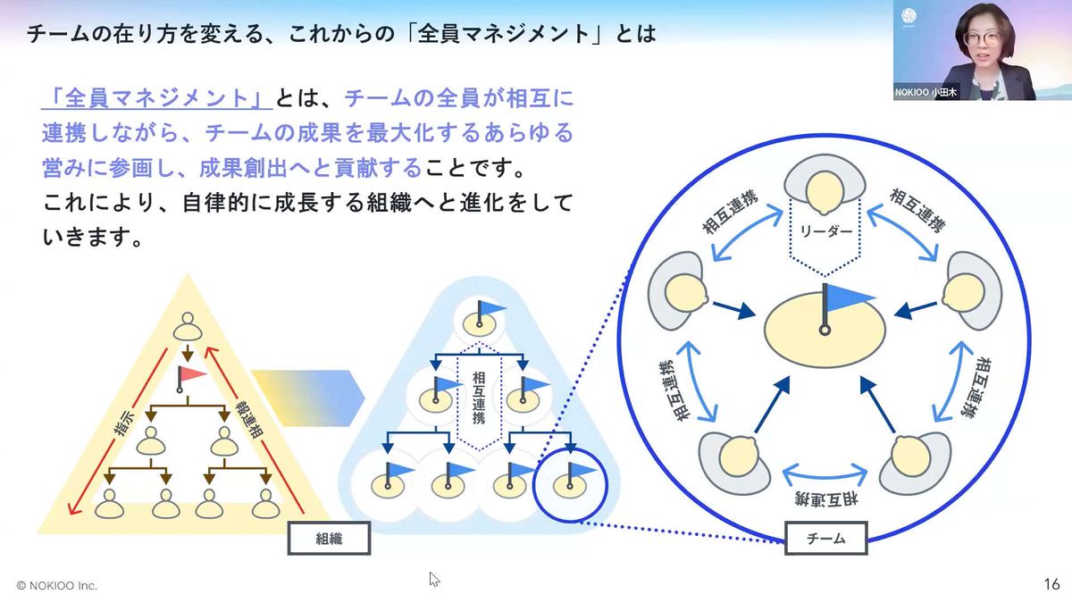 ですので、この階層そのものを崩してしまうという発想ではなく、「上から下へ下ろす」だけではない、階層がありながらも、横と縦がきちんとつながっている状態。そして、一つひとつの機能単位であるチームが、階層の中でその役割を果たすために、全員で連携し、成果の最大化に向かって動けている状態。それが私たちが定義している「全員マネジメント」です。