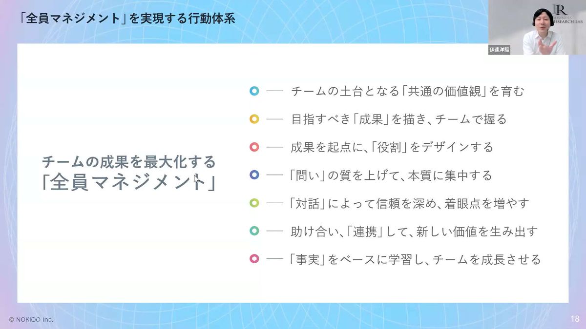伊達:ご質問でいただいている点とも少し関係してくるのですが、「全員マネジメント」をどうイメージすればいいのかという時に、私が重要だと思っているのは、「マネジメント」と「プレイング」をあまり分けすぎないことです。
