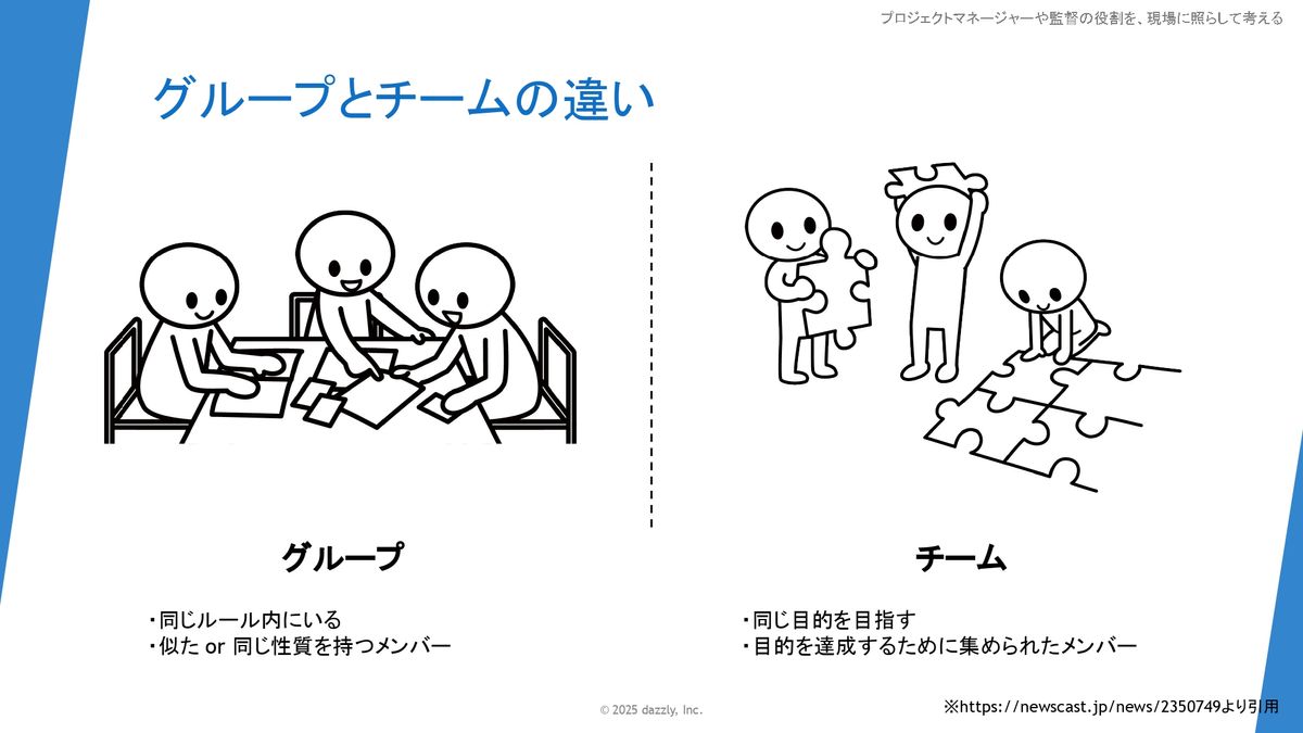 「じゃあ、チームは?」というと、ここでも目的っていう言葉が出てきますが、同じ目的を目指す、目的を達成するために集められたメンバー。そういったメンバーで構成されているものがチームです。