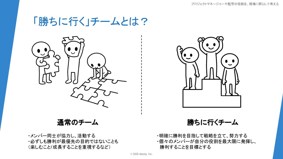 特にプロジェクトってなると、何かしらのゴールを達成するために集まったチームではあるので、それが勝ちにいくっていうところと同じような意味合いになってくるんじゃないかなと。