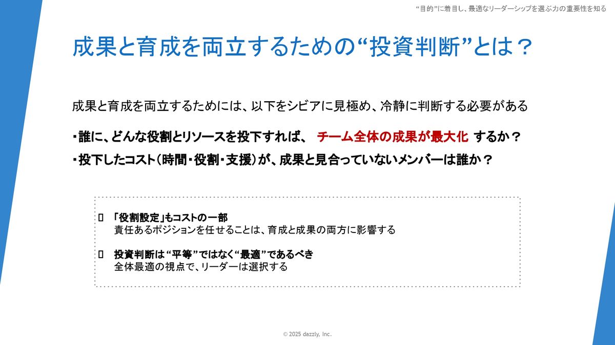 筒井千晶氏:もう1つ、成果を出すリーダーシップのあり方として、この観点も非常に大事かなというご紹介をします。成果と育成を両立するための投資判断です。
