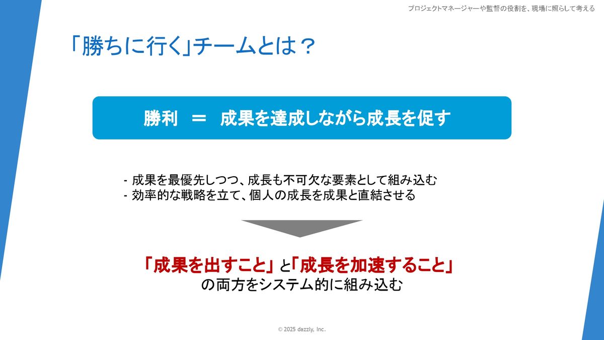 そういう意味でいくと、勝ちにいくチームとしては、先ほどは勝利という言葉を使っていましたが、「成果を達成しながら成長を促す」という意味合いに近しいのかなと考えています。