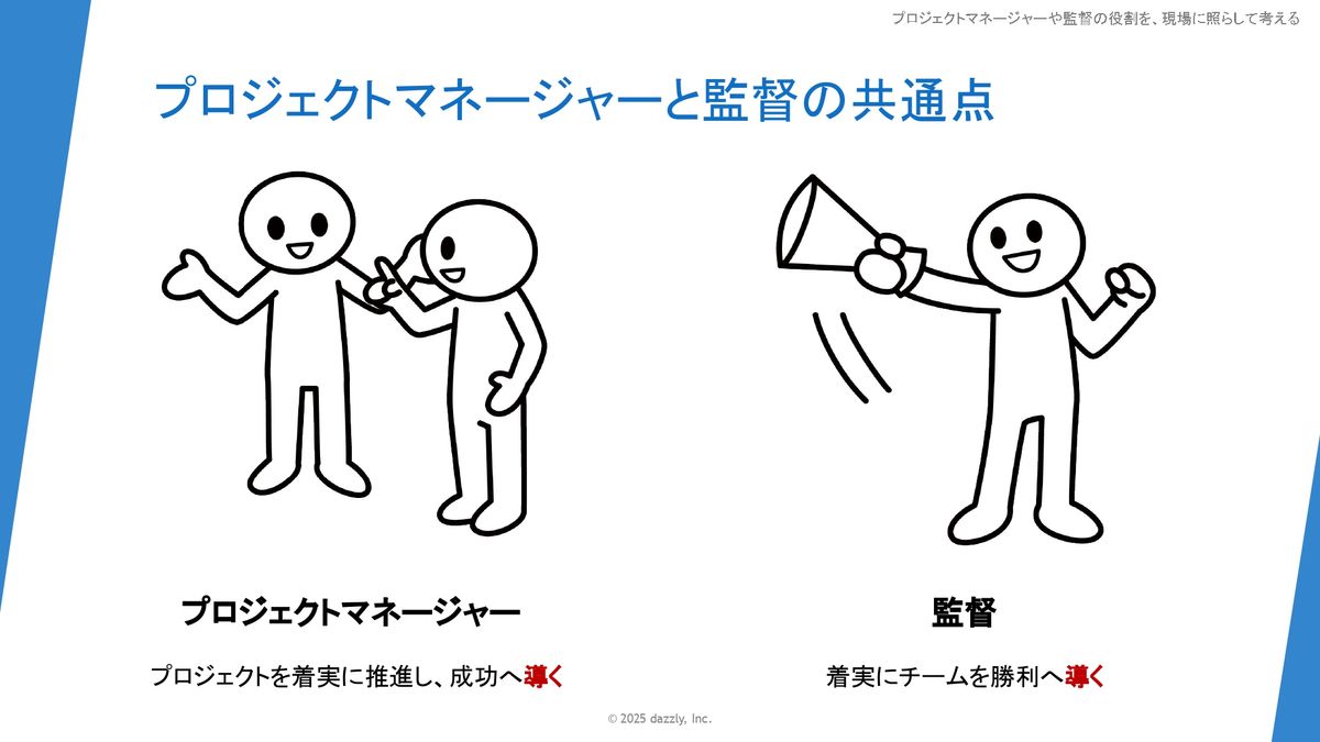 まず、プロジェクトマネージャー、監督の役割として大前提となるものなんですが、プロジェクトマネージャーはプロジェクトを着実に推進して成功へ導く。そういう役割を与えられているものだと思っています。監督は、着実にチームを勝利へ導くところ。なので、導くっていう意味ではすごく似通っているなと感じています。