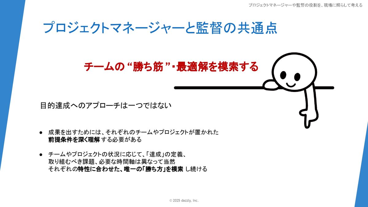 (スライドを示して)「独自の」と記載させていただきましたけど、これは「プロジェクトが変われば」とか、あとチームメンバーが替わったらどんどん変わっていくものだとは思うので、「このチーム、このプロジェクトの場合は何が勝ち筋となり得るんだろう?」というところをいろいろと見極め続けるところが役割としては必要なのかなと思っています。