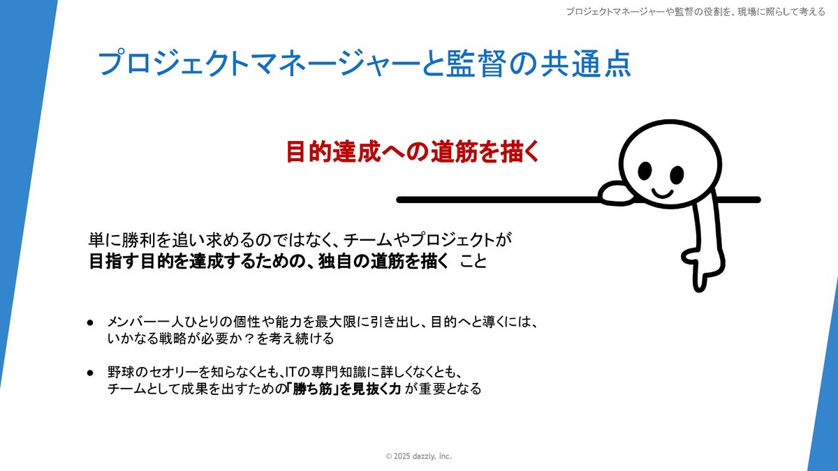具体的な役割として3つほど挙げられればと思っています。1つ目のところが、目的達成への道筋を描くっていうところ。単に勝利を追い求めるのではなくて、チームやプロジェクトが目指す目的を達成するための独自の道筋を描くことがすごく似ているなと思っています。