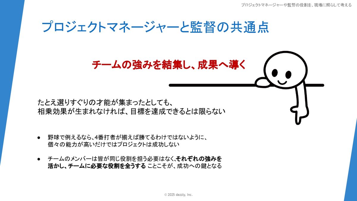 「個々人の特性っていったものを結集をして相乗効果を生み出すためには何が必要なんだろうか?」とかっていうところを、プロジェクトマネージャーなり監督なりがやはりデザインする必要があるのかなと感じています。