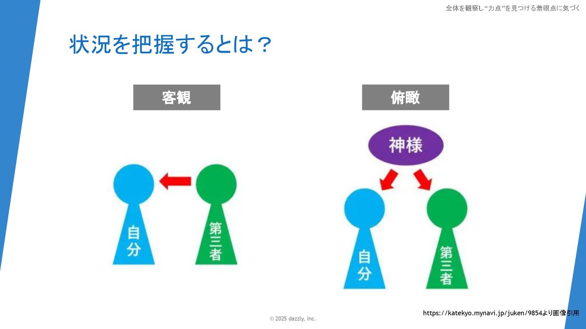 「状況を把握するとは?」ですが、よく客観っていう言葉を使ったりすると思います。客観は自分を第三者の目線から見てみるっていうことなんですけど、もう1つ、俯瞰っていうところもあります。俯瞰は、自分なり第三者なりをさらに上から見る。神の視点とよく言いますが、全体像を捉えるようなところを俯瞰という意味合いで使います。