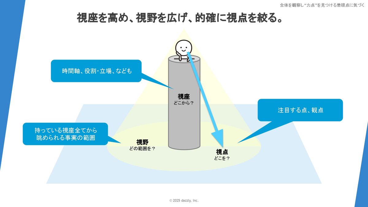 (スライドを示して)じゃあ俯瞰する時にどの観点を意識するのかでいくと、この図が非常にわかりやすいかなと思っています。ちなみに私はこの図を見た時、「視座、視野、視点ってそれぞれこういうことを言うんだ」と感動をしたことをいまだに覚えています(笑)。