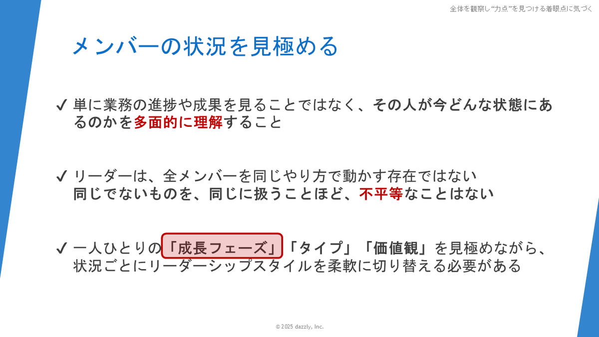 次はメンバーの状況を見極めるというお話になってきますが、ここも先ほどの「観察」の「観」のほうの「観る」と同じで、単に業務の進捗や成果を見るのではなくて、その人が今どんな状態にあるのかを多面的に理解することが必要かなと思っています。