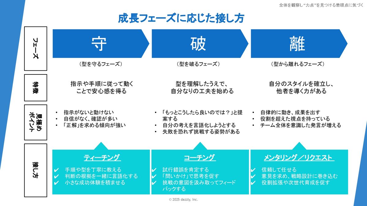 まず「守」のフェーズにいる方に対しては、いわゆるティーチング、教えるのが大切かなと。手順や型を丁寧に教えたりとか、あとは何かを判断する根拠だったりを一緒に考えてあげるとか、小さな成功体験を積ませるというところです。
