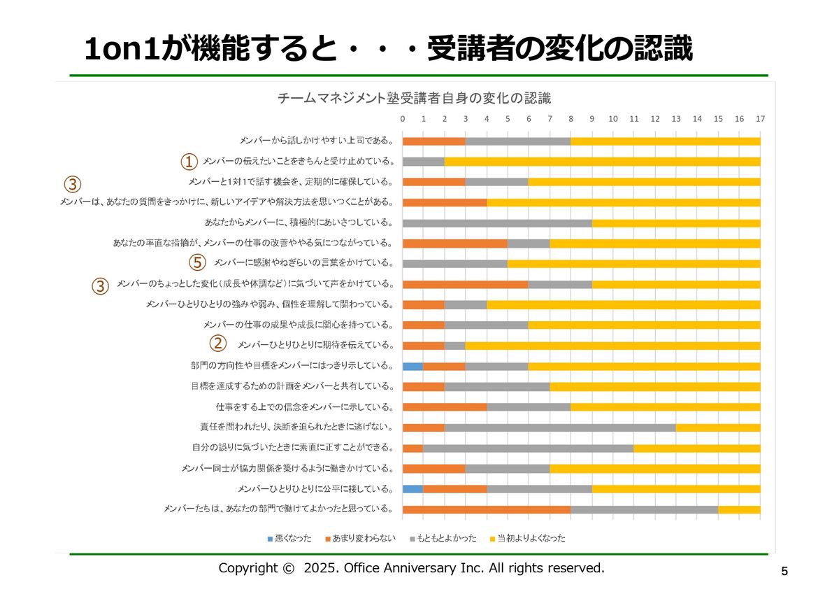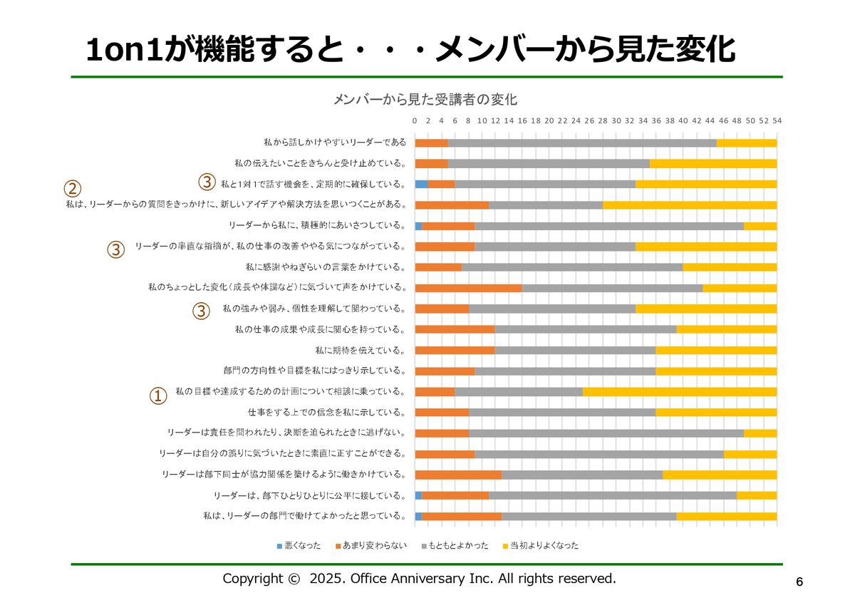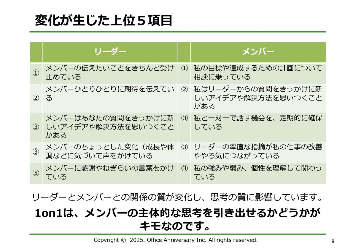相手に考えさせる。自分がどうするのかを決めさせるような会話をしないと、良い1on1にならないということなんですね。逆に言うと、今回のこの対象者の方々はそれが実現できていたので、こういう変化を起こしていることを意味しているなぁと思います。