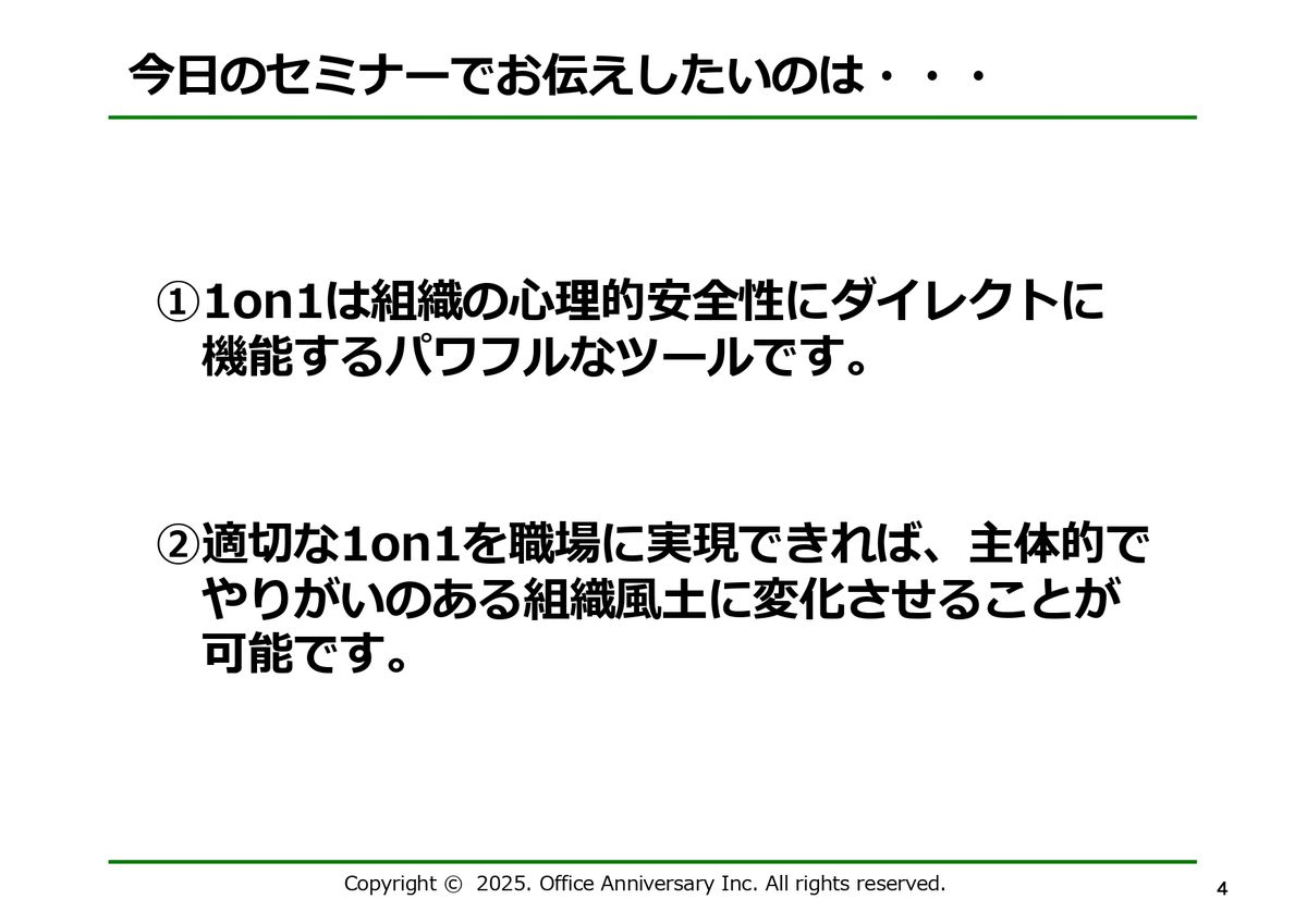 資料に戻ります。結論からお伝えしようと思っているんですが、1on1って、組織の心理的安全性にダイレクトに機能するパワフルなツール、なんでも言える職場を作ることができるツールだなと思いますね。