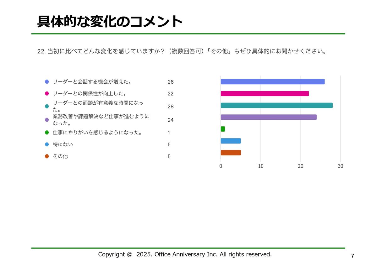 「当初に比べてどんな変化を感じていますか?」ということですが、まず「リーダーと会話をする機会が増えた」というのがけっこう多いですね。つまりリーダーとの関係性が向上した。面談が有意義な時間になった。業務改善や課題解決など仕事が進むようになった。この4項目が多くの人が選択していることになります。