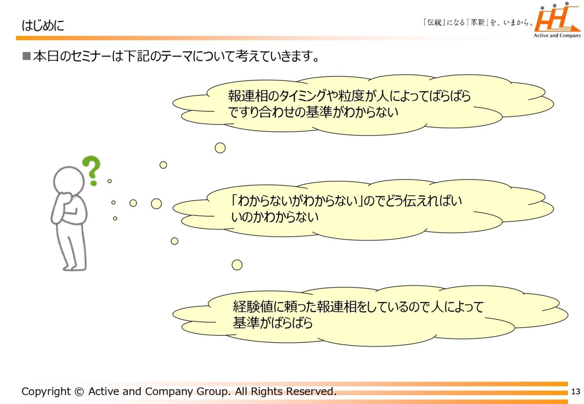 (スライドを示して)今回は報連相がテーマになりますので、スライドにあるようなテーマについて考えていきます。「そもそも報連相のタイミングとか粒度が人によってバラバラで、すり合わせの基準がわかりません」。これ、けっこうあるんじゃないでしょうか。