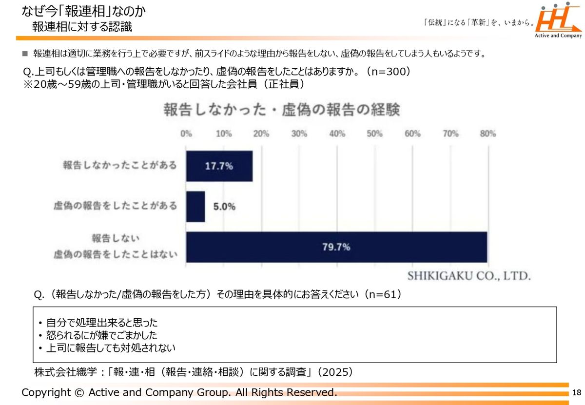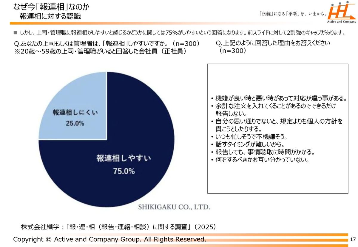 重要だという意識はありながらも、「報連相しやすいですか?」って聞くと、75パーセントに下がるんですよ。2割強のギャップが生じるというところですね。