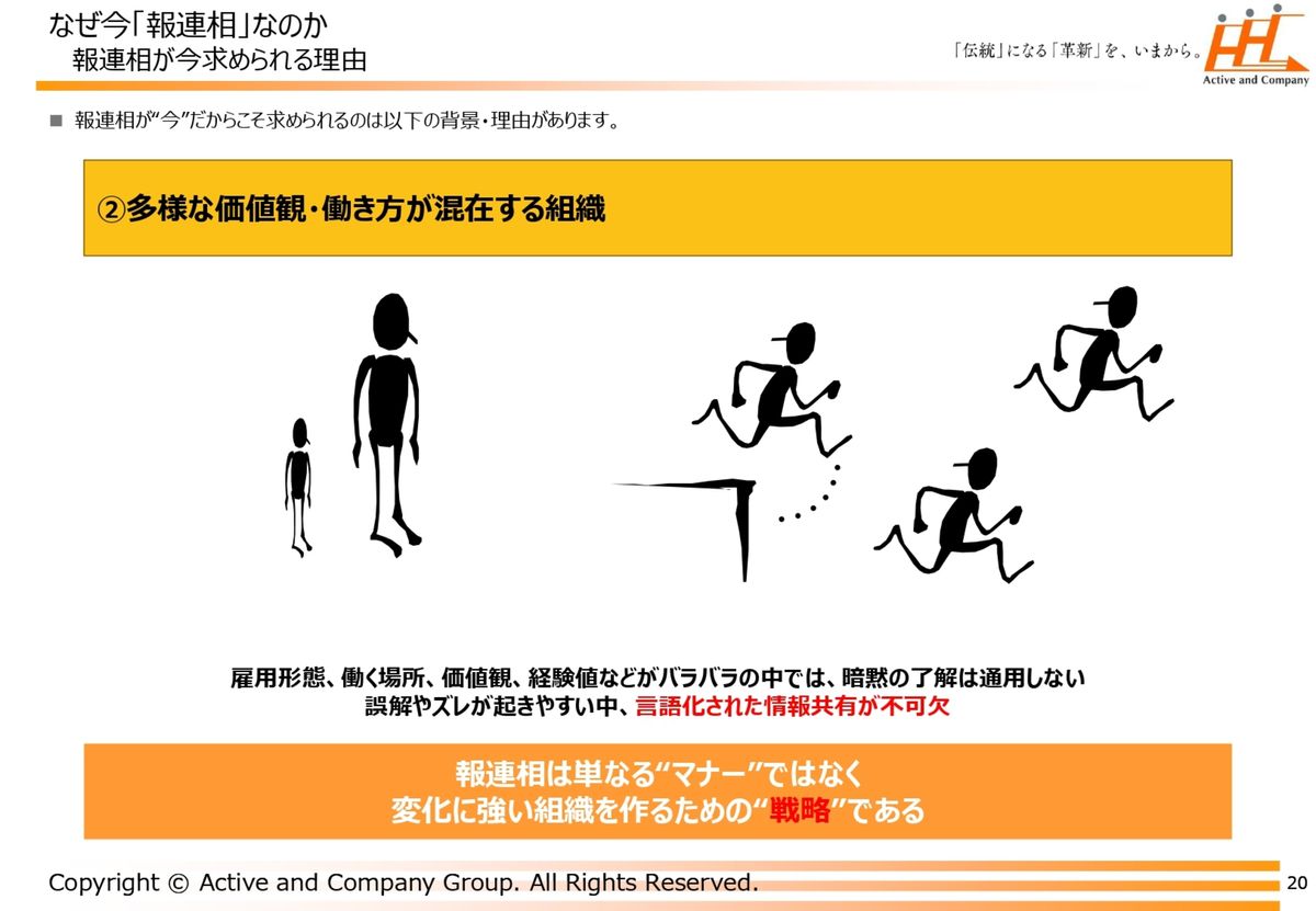 つまりハイコンテクスト、「感覚ベースで」とか「暗黙知で」とかでやっていたものが通用しない。こまめに状況の共有とか方向性のすり合わせとかが必要になってくる。そうすると、それを行うツールとして報連相がすごく重要で、質の高い報連相ができていけばできるほど、柔軟に戦略のかじを切るための鍵となってくるっていうところですね。
