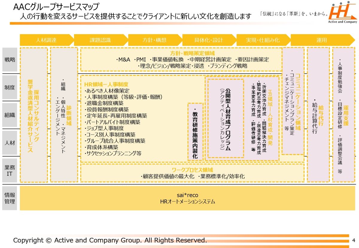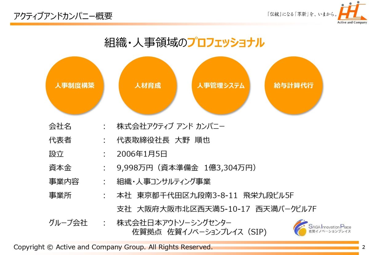その前に弊社のご紹介をさせてください。弊社、アクティブ アンド カンパニーは組織・人事領域のプロフェッショナルで、人事制度構築や人材育成、人事管理システム、給与計算代行といった人事領域に関して幅広くサービスを提供させていただいております。