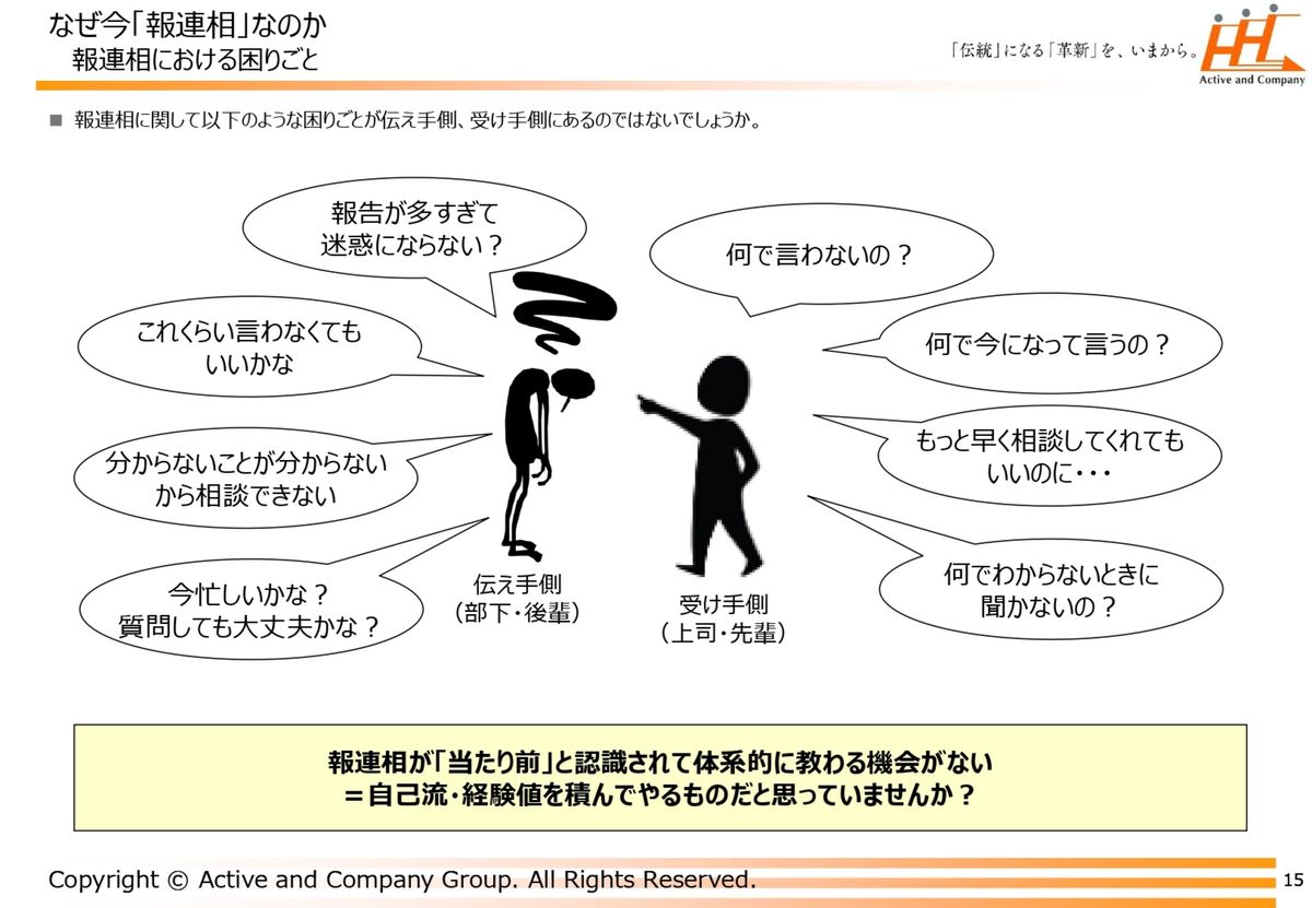 逆に受ける側、上司とか先輩とかのお困りごととして、「なんで言ってくれないの?」とか、あるいは「なんで今になって言うの? もうちょっと早く言ってよ」「もうちょっと早く相談してくれてもよかったのに」とか。あるいは「なんでわからない時に聞けないの?」とかの困りごとがたぶんあるのかなと思っています。