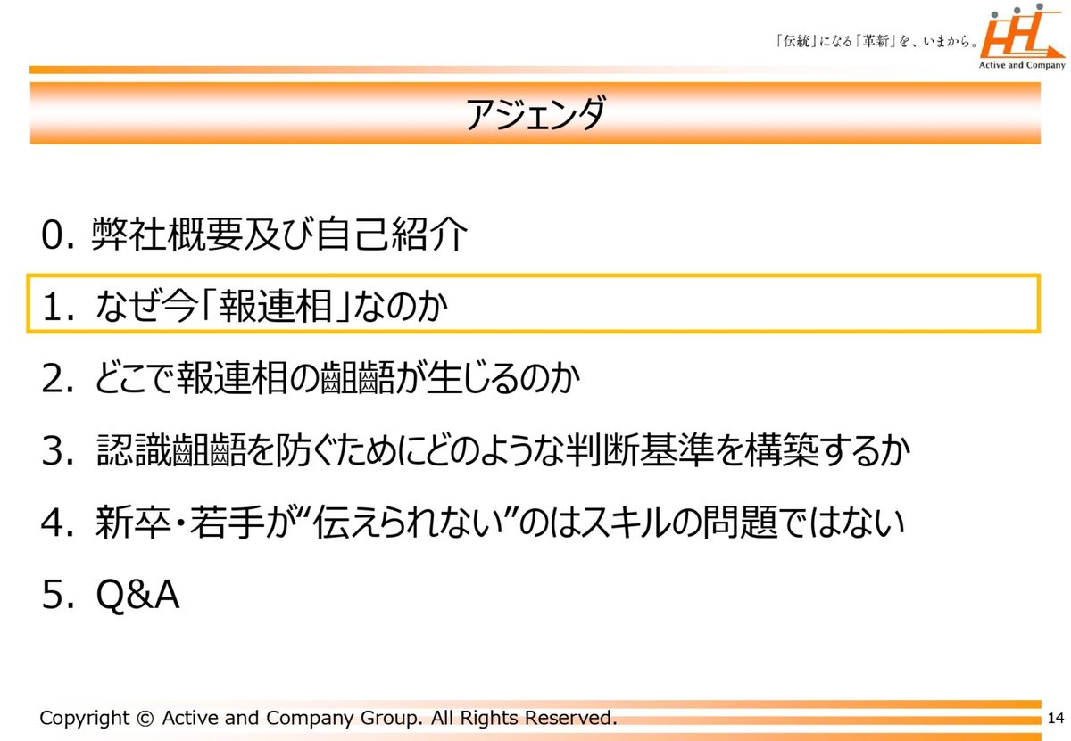 (スライドを示して)今回はこういうアジェンダで進めていきます。最初に「なぜ今、報連相なのか」ですね。記事とかを見ていると、「報連相なんて古いよ」みたいな話とかもあったりはしますが、「そもそもできていないのに何が古いんだ?」っていう話だと思うので(笑)。そもそもとして「なぜ今、報連相なのか?」をお話しできたらなと思っております。