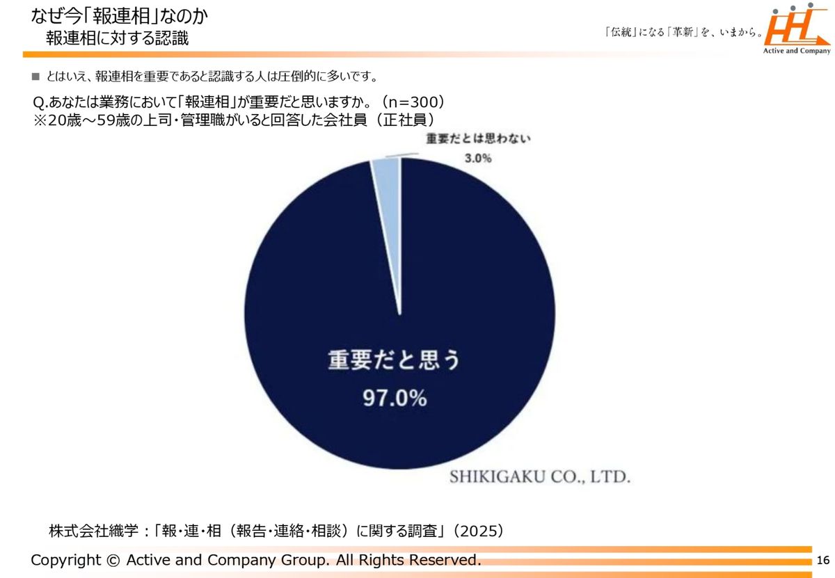外部環境とかデータとかも示したほうがいいかなと思うので。識学さん(株式会社識学)のデータなんですが、「報連相が重要だと思っている人ってどれぐらいいるの?」というところで、上司・管理職がいる社員の97パーセントが重要だと思っています。