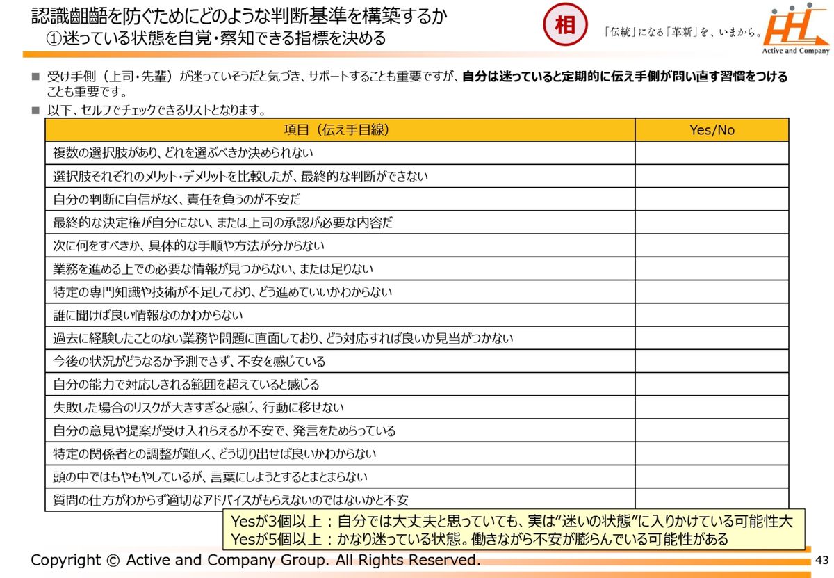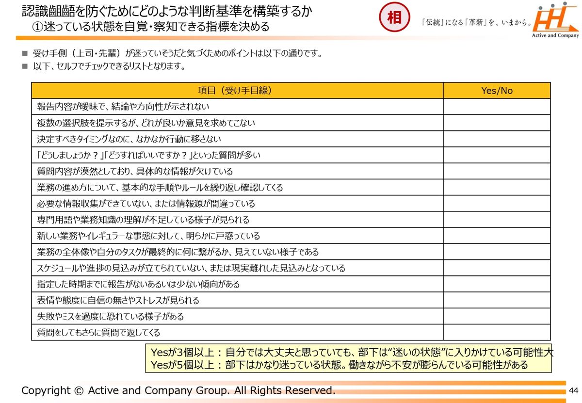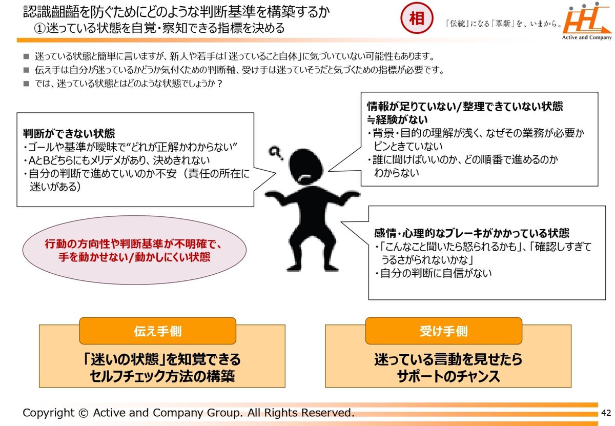 「迷っている状態って何ですか」っていうところですよね。新人・若手が迷っている状態に気づいていない可能性もあるので、伝え手側も「自分、迷っているな」って気づくための判断軸も必要ですし、マネジメントする上司側のほうも、「この人、迷ってそうだな」って気づくための指標も必要です。