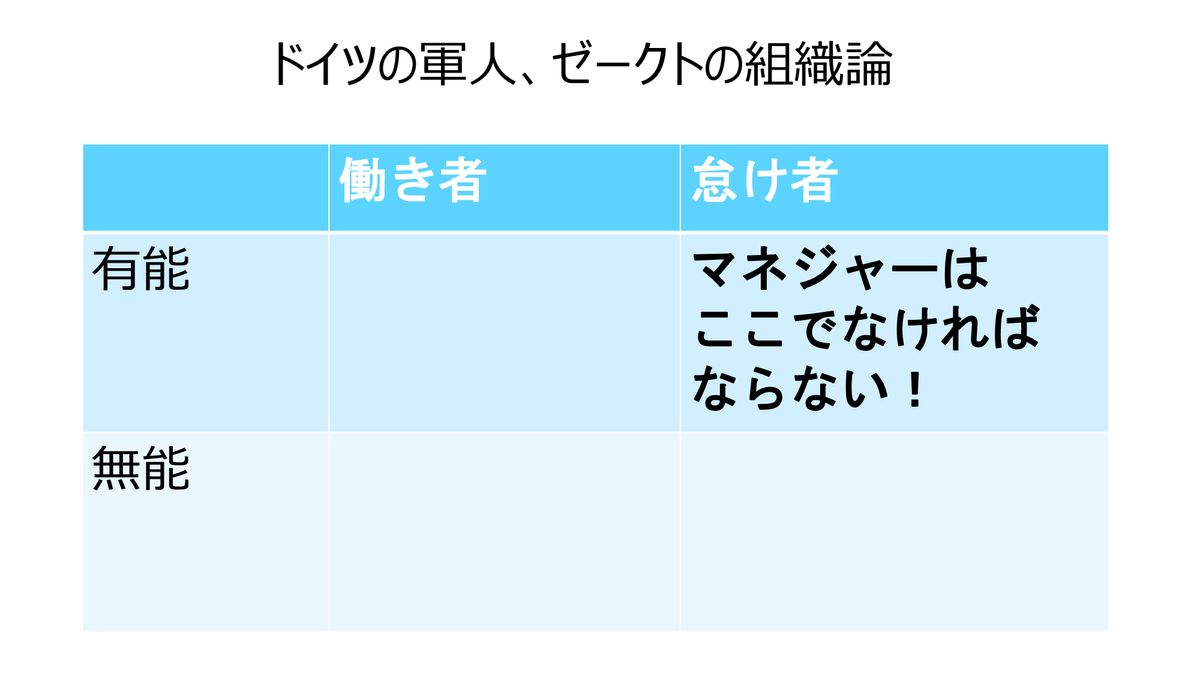 何度も繰り返しますが、「有能だ」「無能だ」「働き者だ」「怠け者だ」というのはかなりストレートで抽象的な表現なので、これを実際に現場で適用しましょうとか、あなたの考え方にそのままインストールしましょうということではありません。メッセージをうまく受け取らないといけないんですね。ぜひみなさん、考えてみていただきたい。