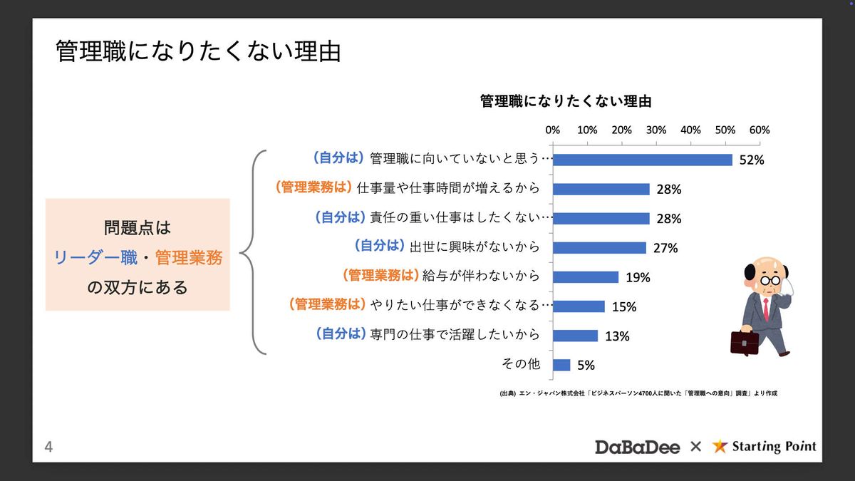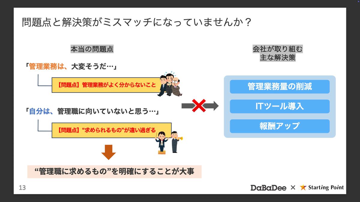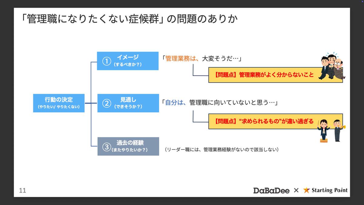 ここまでを踏まえると、管理職になりたくないという問題は「今時のリーダー職ってどうなんだ?」と人にフォーカスしがちですが、リーダー職の人のほうにもありますし、管理業務のほうにもある。この両方にあるということをまず押さえておきたいと思います。