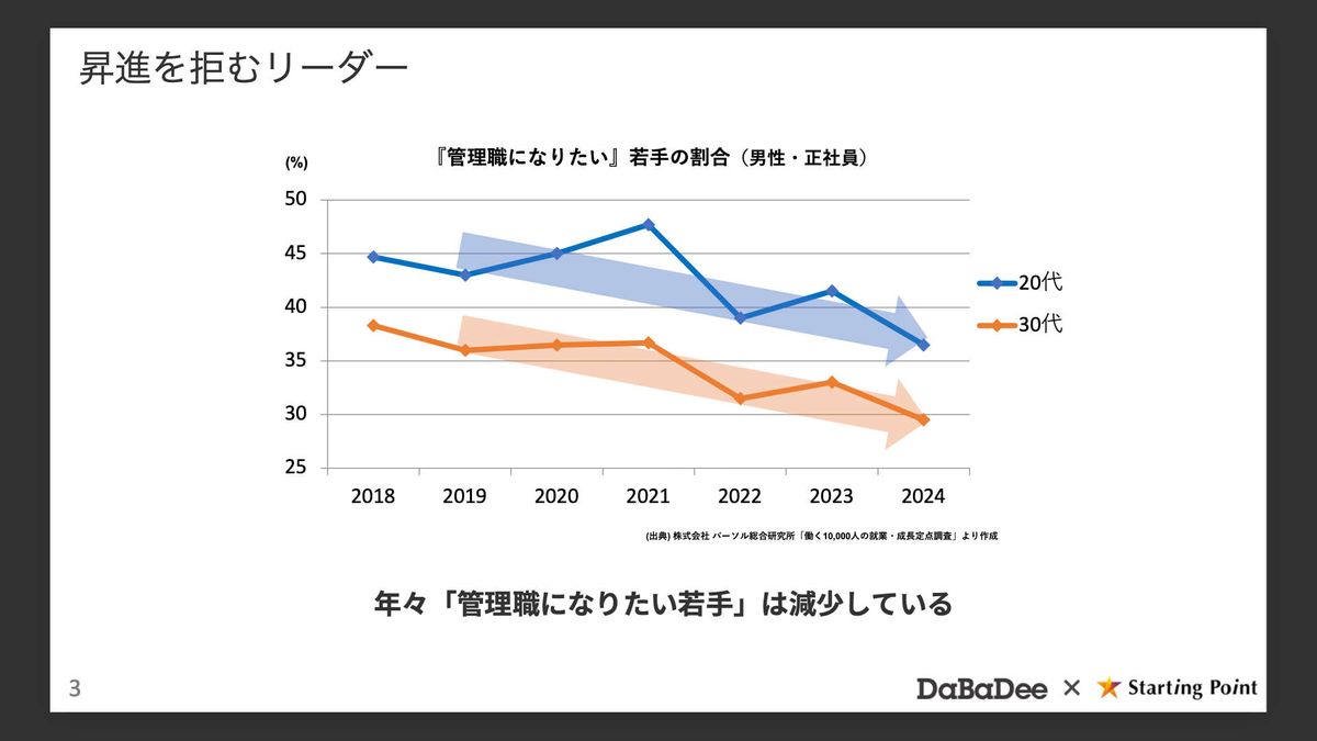 現状を整理しますと、まず昇進を拒むリーダーということで、年々管理職になりたいという若手が減少しています。