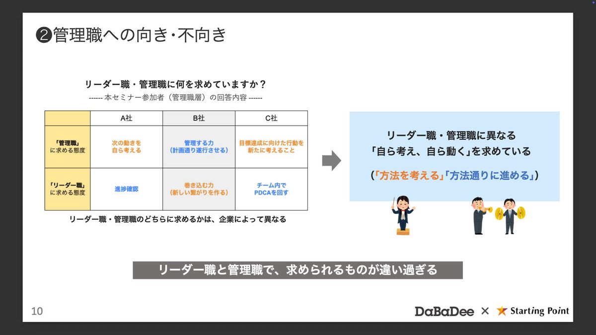 続いては「見通し」です。つまり「自分は向いていないのでは」という感覚がここに当たります。そこで「管理職への向き・不向き」を検証するため、当セミナー参加者に「各社ではリーダー職と管理職に何を求めているか」をアンケートで尋ねました。