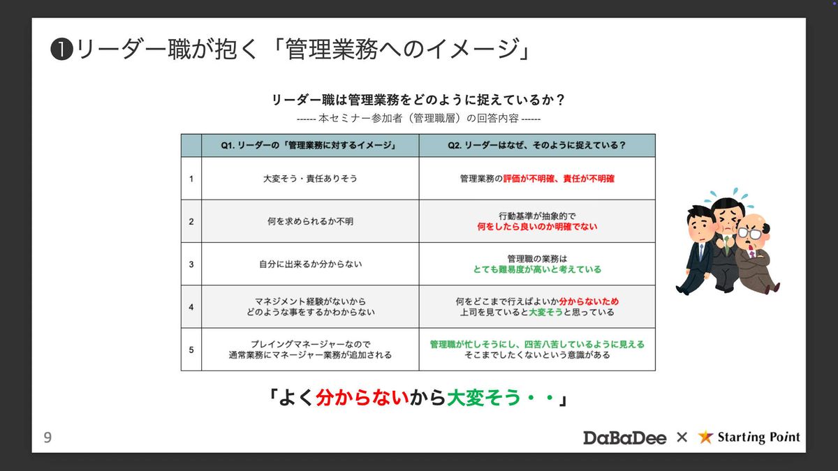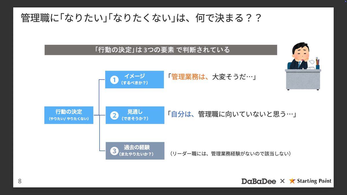 まず、今回のセミナーの狙いです。最近、「管理職の罰ゲーム化」みたいな言葉が出ています。管理職候補者であるリーダーが「決断をしない」とか、「後輩に助言・意見をしない」「管理職を目指そうとしない」といったことが見受けられます。こういった「リーダーがなぜ消極的なのか」という心理的背景や原因を深掘りすることを目的としています。
