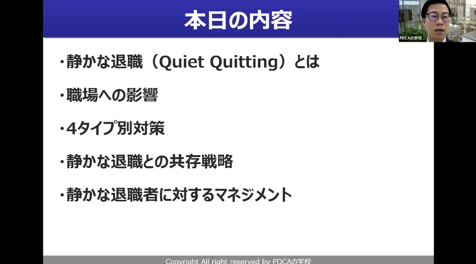 静かな退職が絶対悪かというと実はそうでもなくて、共存していけるという戦略もございますので、こちらをお話しさせていただきます。最後に、静かな退職者に対する具体的なマネジメントの部分をお話しさせていただくという、そんな内容でございます。