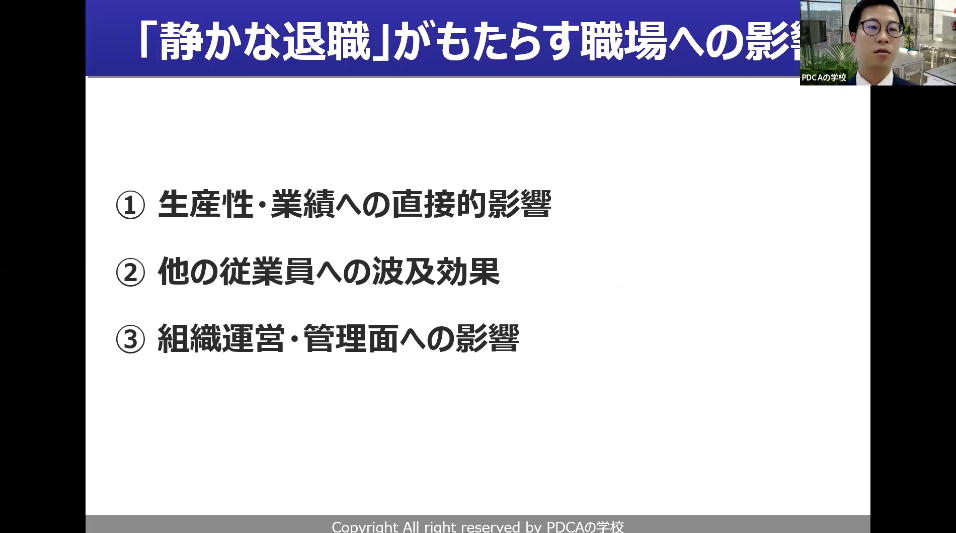 これがどういうふうに職場に影響していくかといいますと、静かな退職の定義として、「最低限でいいや」というところが1つございます。「最低限でいいや」の社員が増えるとどうなるかというと、当然ながら生産性・業績への直接的な影響が出てまいります。